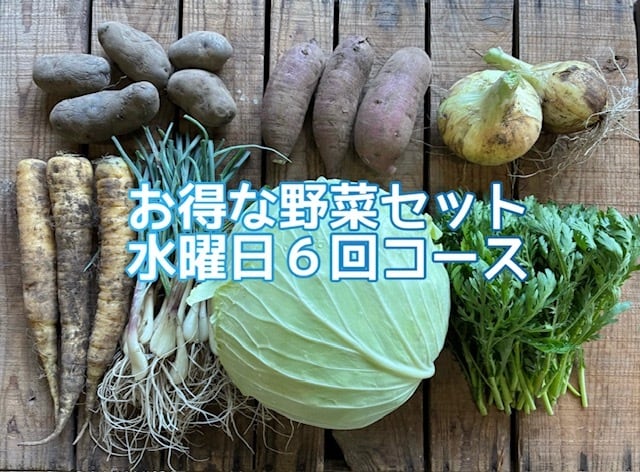隔週水曜日にお届けする旬の野菜詰め合わせ6回コースです。単発セットよりも150円お得になっております。その時々の旬のお野菜が入ります。2名から3名さま向けのボリュームです。